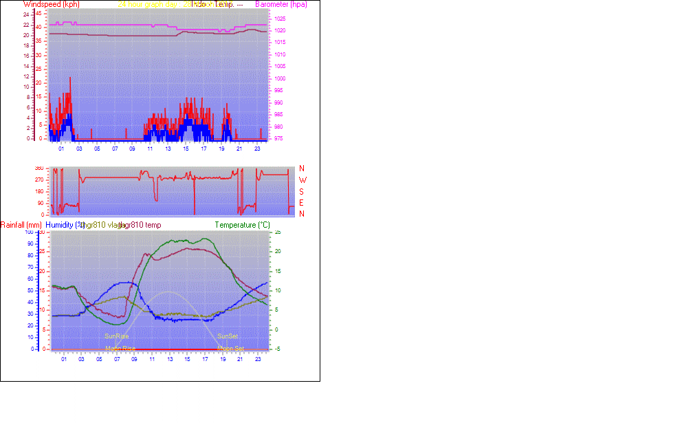 Maximum gust speed = 27.8 km/h from 068°(ENE) on day 01 at time 02:08