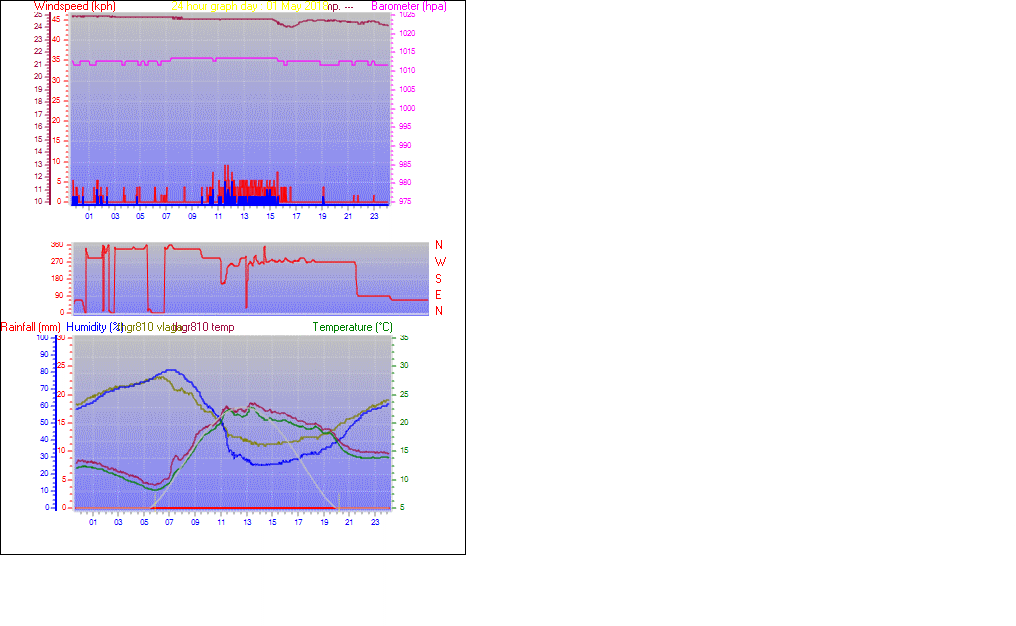Maximum gust speed = 9.3 km/h from 270°( W ) on day 01 at time 11:47