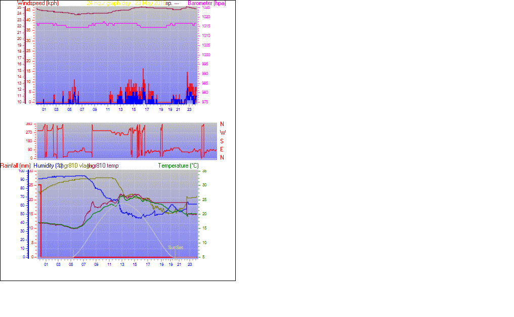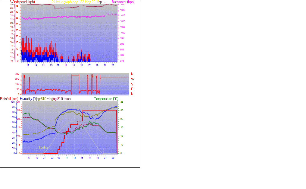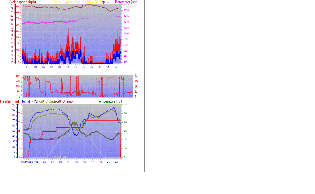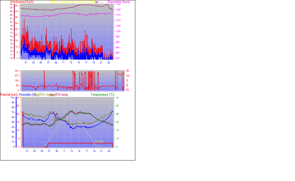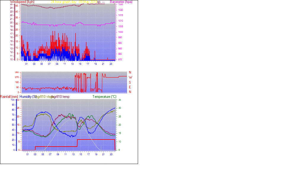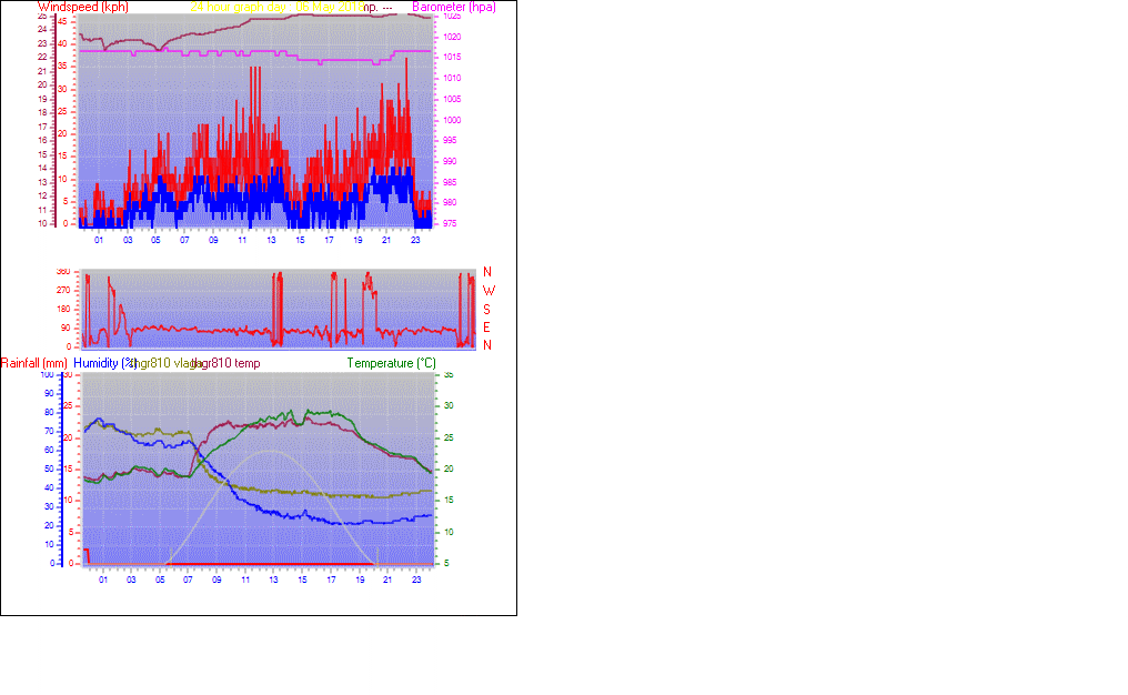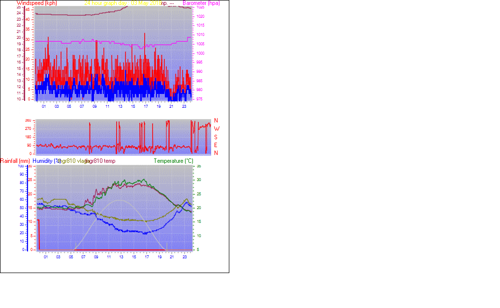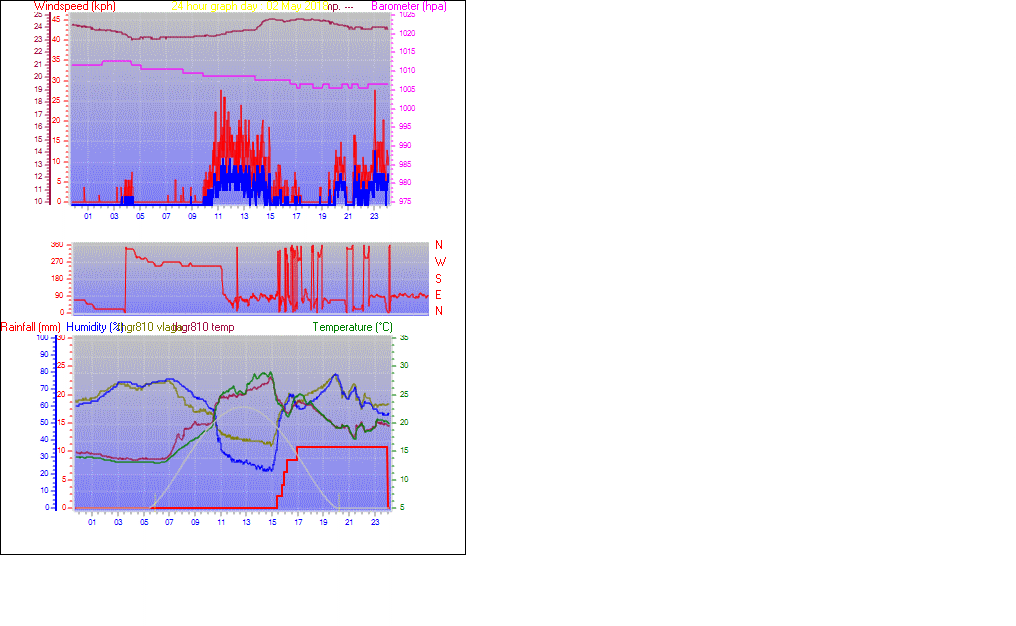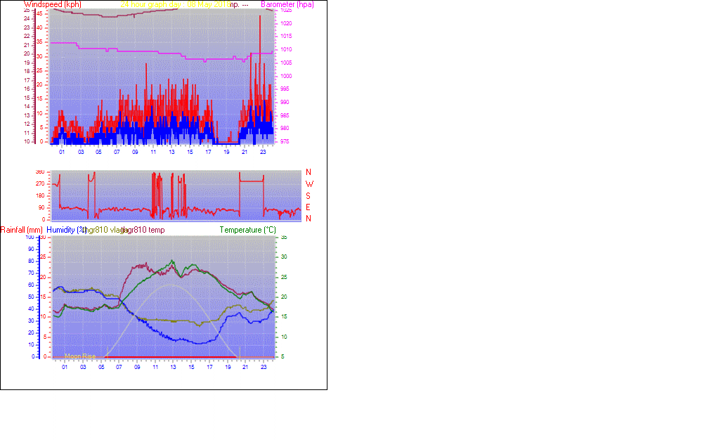 Maximum gust speed = 27.8 km/h from 085°( E ) on day 02 at time 23:07