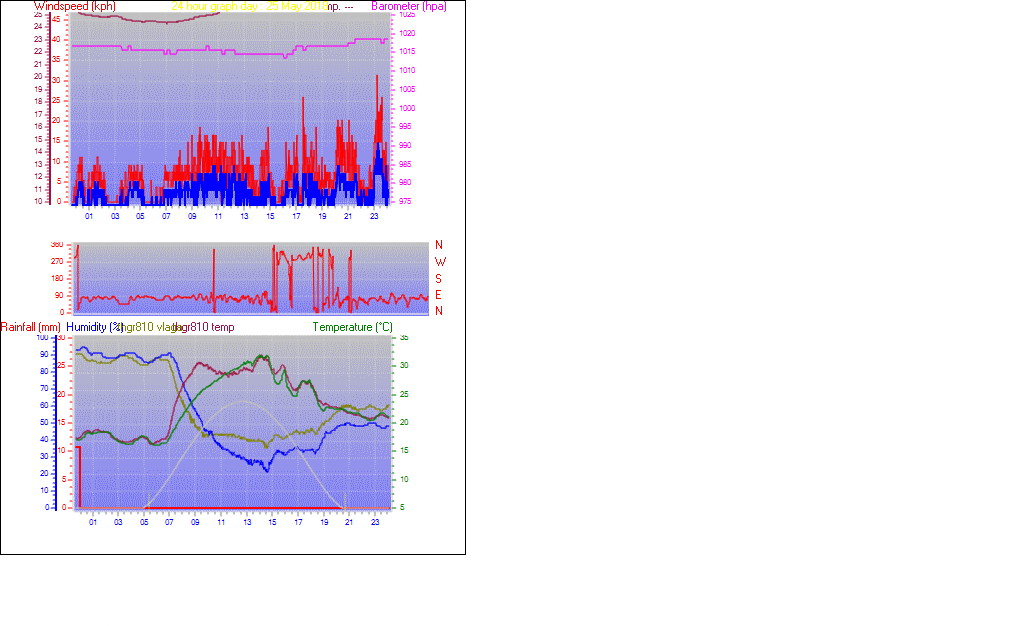 Maximum gust speed = 31.5 km/h from 057°(ENE) on day 25 at time 23:18