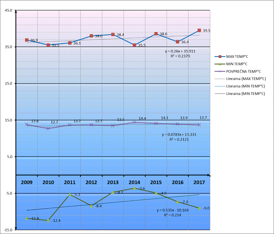 | LETO | MAX TEMP°C | MIN TEMP°C | POVPREČNA TEMP°C | ||||||||||