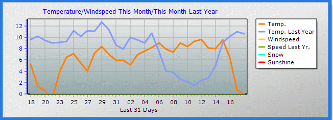 Maximum windspeed = 0.0 kmh from 0-0°( N ) on day 18 at time 00:02