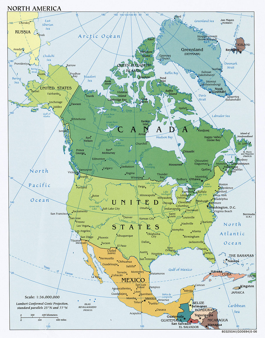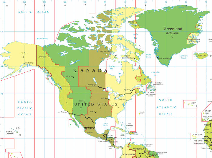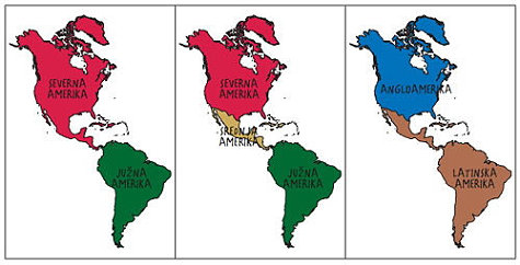 - Severno (Kanada, ZDA, Grenlandija), Srednjo (Mehika, države Medmorske Amerike in Karibov) in Južno Ameriko.