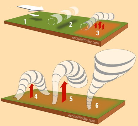Nastanek tornadaTornadi nastanejo v nestabilnem ozračju - stik hladnega in toplega zraka (npr. če je zaradi sončnega sevanja zrak lokalno pregret in toplejši od okolice). Hladnejši zrak (težji) začne izpodrivati toplejšega (lažji). Pri tem pride do vzgona, ki sili toplejši zrak navzgor, ker je njegova gostota manjša kot v hladnejšem. Večja ko je temperaturna razlika med okolico in dvigajočim zrakom, intenzivnejše in hitrejše je dvigovanje zraka (kot balon na vroč zrak, ki se dviguje). Ob dvigovanju se zrak razpenja in opravlja delo. Zato se dvigajoči zrak ohlaja. Z ohlajanjem se vodna para v oblaku kondenzira. To lahko vidimo kot nastanek oblakov. Dokler je temperatura dvigajočega se zraka višja od okoliškega, se bo dvigovanje nadaljevalo.