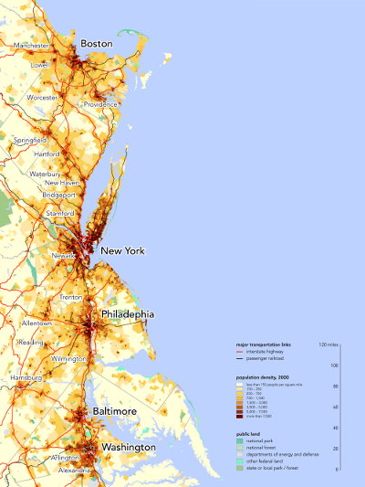 Največji ameriški megalopolis je BosWash (Boston–Washington) ali BoNYWash (Boston–New York–Washington) obsega 800 km dolg in 250 km širok pas ob severovzhodni obali ZDA. Na tem območju živi 52,3 milijone ljudi (17% ameriškega prebivalstva). Severnoameriški megalopolisi so tudi območja od Chicaga do Pittsburgha ter od Los Angelesa do San Diega idr.