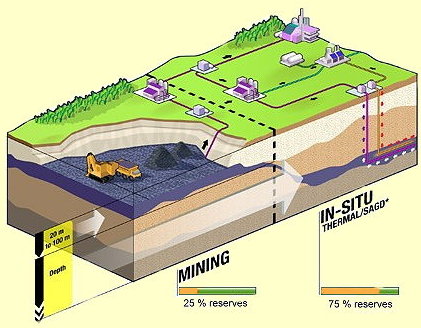 Dnevni kop naftnega peska (levo) in črpanje ogljikovodikov neposredno iz globokih nahajališč (desno). Vročo vodo in paro črpajo globoko med plasti naftnega peska, da ločijo ogljikovodike, ki jih posrkajo na površino.