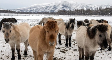V kotlini med gorami se razprostira mešanica tundre in tajge, kjer se mirno sprehajajo kosmati konji, nič večji od cirkuških ponijev. Njihova gosta dlaka pozimi zraste do 10 cm, griva pa jim ne pokriva tudi del hrbta.