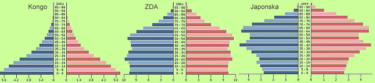 Prebivalstvene piramide Konga, ZDA in Japonske leta 2014 - nerazvit mlad, zrel in star demografski režim (vir: CIA Factbook)