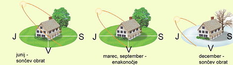 Ker se nahajamo na severni polobli (poluti, hemisferi), se nahaja navidezna pot Sonca vedno na jugu. Poleti je Sonce opoldne višje na nebu, pozimi nižje.