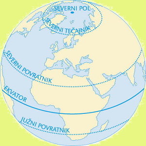 - Ekvator (0° geografske širine). Nanj sončni žarki padajo navpično ob enakonočjih.