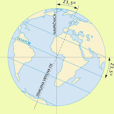 Nagnjenost Zemljine osi vpliva na letne čase, na dolžino dneva in noči ter na oblikovanje 5 značilnih vzporednikov: