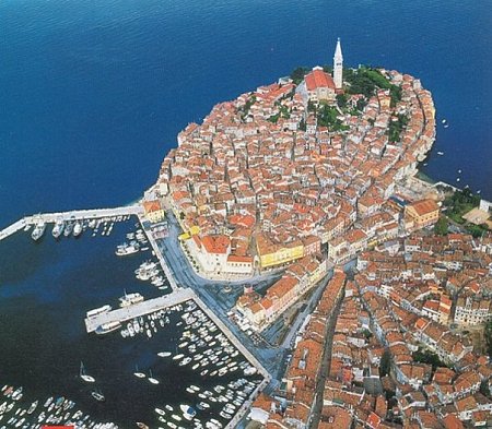 Manhattan v New Yorku in Rovinj - prometne avenije in prečno potekajoče ulice ter prostorsko omejeno mediteransko mesto pod cerkvijo (bistvene razlike v tlorisu in videzu mesta)
