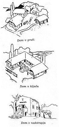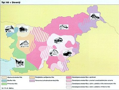 Kmečki dom v gruči je značilen za naš alpski svet in hribovita območja. Dom v ključu najdemo v panonskem svetu. Dom v nadstropju je bil tradicionalen na Primorskem. Za kmečke domove so bili značilni tudi posebni gospodarski objekti. V alpskem svetu so potrebovali kozolce za sušenje in shrambo sena. V panonskem svetu so se pojavljale koruznice in svinjaki. V Primorju so zaradi težke gradnje v nadstropju stanovali, hlev pa so imeli v pritličju. Danes te posebnosti izginjajo. |