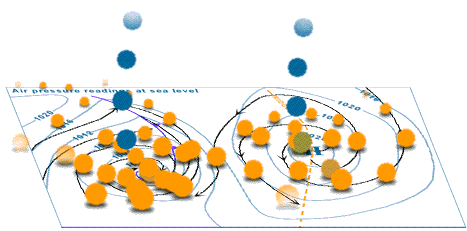 Cikloni in anticikloni so počasni zračni vrtinci s premerom do nekaj tisoč kilometrov. V njih nastajajo stiki različno toplih zračnih mas, ki se med seboj ne mešajo, ampak se stikajo v nagnjenih površinah - frontah (tople in hladne fronte). Vsako sklenjeno območje nizkega zračnega pritiska imenujemo barična depresija sli ciklon. Najnižji tlak je v središču ciklona, zato se tja pri tleh stekajo vetrovi. Ne pihajo naravnost, ampak ukrivljeno (na S poluti v obratni smeri urinega kazalca). V središču ciklona se začne potem zrak dvigati v višine, posledica tega pa so adiabatno dviganje, ohlajanje in padavine. V anticiklonu - sklenjenih območjih visokega zračnega pritiska - pa se zrak v središču spušča z višin ter se adiabatsko segreva (kot zračna "pumpa" za kolo - ko napihuješ zračnico, se tlačilka segreje, ker molekule zraka ob stiskanju "znorijo"). Drobne kapljice v oblakih izhlapijo. Anticikloni prinašajo večinoma jasno in lepo vreme. V anticiklonu se vetrovi pri tleh raztekajo na S poluti v smeri urinega kazalca.