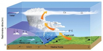 Ko nas topla fronta preide, padavine ponehajo. Nad nas pride hladna fronta. V njej hladen in težek zrak izpodriva toplega. Nagib hladne fronte je večjikotg nagib tople fronte, zato je ohlajanje zraka izrazito in hitro. Posledica so izdatne kratkotrajne padavine z nevihtami in grmenjem. Kadar preide naše kraje hladna fronta se ozračje precej ohladi.