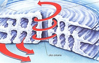 oko orkana - posebnost tropskih ciklonov je brezvetrno območje, ki nastane v središču ciklona