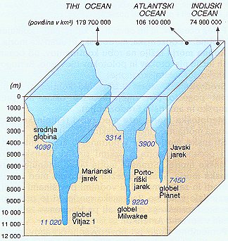 - Po površini in globini primerjaj vse tri oceane ter v atlasu poišči najgloblje točke v posameznih oceanih.