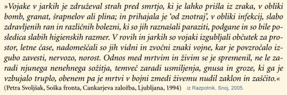 Prva svetovna vojna je bila totalna vojna. Na frontah so vojake v strelskih jarkih najbolj pestili boji, strah, obup, nehigiena in dolgčas. Fronta je bila odvisna od oskrbovanja iz zaledja. Vse je bilo podrejeno vojni - propaganda, racionalizacija, cenzura, gospodarstvo in vsakdanje življenje.