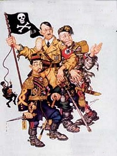 Povej, koga prikazuje karikatura, kaj pomeni zastava z mrtvaško glavo in kaj možic na vrvici! Preberi učno gradivo in ugotovi interese Nemčije, Italije in Japonske!