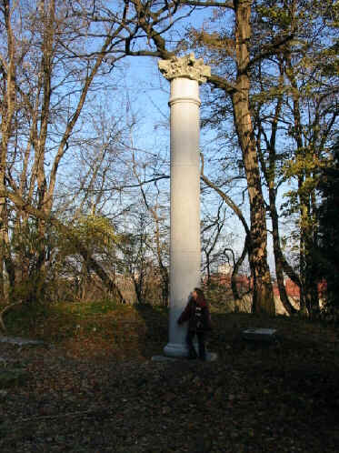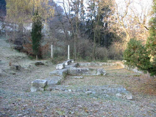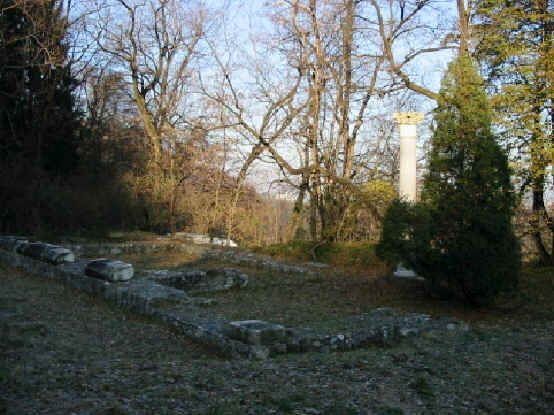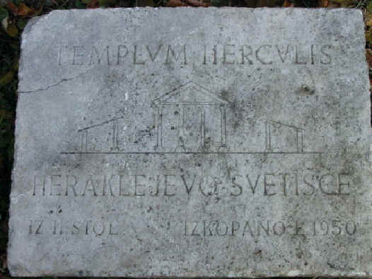 | Na zahodni strani svetišča so odkrili temelje, ki so pripadali drugemu poslopju. Ugotovili so tudi dva gradbena sloja s stavbnimi in drugimi ostanki ter ogljem. Iz tega je mogoče sklepati, da se je na tem mestu ponovno gradilo. Prof. Klemenc trdi, da je tu prvotno stalo predrimsko svetišče, posvečeno domačim bogovom. Bilo je požgano. Najbrž za Antonina Pija so Rimljani zgradili Herkulovo svetišče in še ustrezne stavbe poleg njega. Tudi ta poslopja so zgorela, verjetno jih je uničil kralj Atila. Po končanem izkopavanju so temelje svetišča pustili nepokrite. Da bi bila vidna prvotna višina, so postavili tri stebre, enega s kapitelom. | ![]() |