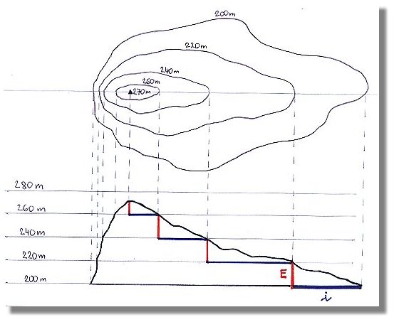 E - ekvidistanca (na karti poiščemo višinsko razliko med dvema izohipsama) i - interval (izmerimo razdaljo in pretvorimo s pomočjo merila karte)