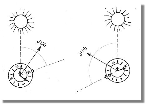 Določanje strani neba s pomočjo ure: Mali kazalec obrnemo proti soncu. Jug se nahaja na simetrali kota, ki ga oklepata mali kazalec in številka 12.