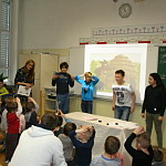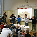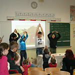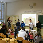 Petošolci, ki se učijo nemščino kot neobvezni izbirni predmet, so jim skupaj z učiteljico Jernejo Pavlič pripravili zanimivo urico: v nemščini so zaigrali znano pravljico o treh prašičkih, nato pa malčke skozi igro naučili tri nemške besede (das Schwein, das Haus in der Wolf) ter pesmico Bruder Jakob. Otroci so pozorno poslušali, se takoj vključili v igro in razigrano zapeli s petošolci. Povedali so, da se nemščine še ne učijo, nastop pa jim je bil zelo všeč.