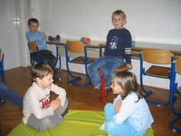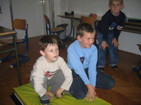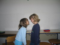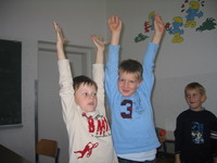 Učenci pozorno opazujejo in poslušajo učiteljico, hkrati pa posnemajo učiteljičine gibe. Čez nekaj časa že samostojno ob navodilih upoštevajo in izvajajo različne gibe.