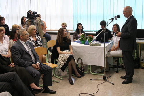 Tako smo ob tej priložnosti tudi uradno >odprli< učilnico za nemški jezik, v kateri že od meseca decembra pouk poteka na bolj moderen način. Po zaslugi Goethe Instituta in projekta PASCH smo dobili prenosni računalnik, LCD projektor, dve mobilni tabli, staro zeleno tablo je zamenjala velika nova magnetna, dobili pa smo tudi celo vrsto didaktičnega materiala (učbenike, knjige, priročnike za učitelje, DVD-je in CD-je, didaktičnih iger.).