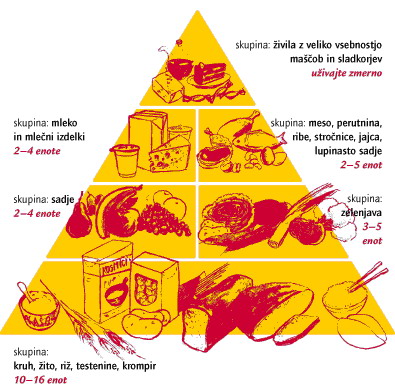 pravilen ritem prehranjevanja: zajtrk, kosilo, večerja in po možnosti dva manjša vmesna obroka (priporočljivo sadje in zelenjava),