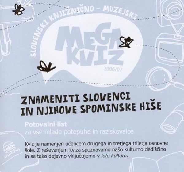 kviza: Reševanje MEGA kviza bo od oktobra do marca. Organiziralo ga bo 62 splošnih knjižnic in 63 muzejev - v sodelovanju s šolskimi knjižnicami oz. šolami. Kviz rešujemo po sklopih : V vsakem sklopu je praviloma 6-8 vprašanj na temo: - umestitev obravnavanega znamenitega Slovenca v časovni trak, - zakaj in po čem je znamenit, - njegova najbolj pomembna dela, - njegov prispevek v evropskem prostoru, - zapis njegovega imena in upodobitev, - rod in socialni položaj njegove družine, - kakšna je njegova spominska hiša, - kulturna krajina in njene arhitekturne značilnosti, - nekaj vprašanj o vedah s področja muzejev, - nekaj vprašanj o bralni znački. |
