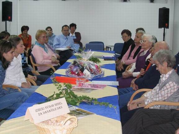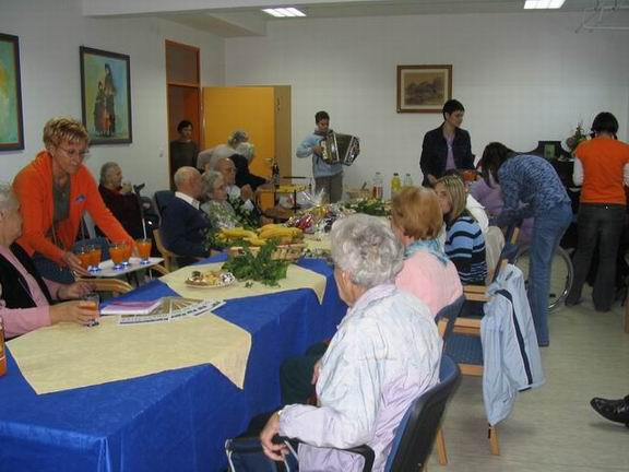 V sredo, 20. oktobra smo se, tokrat v večjem številu napotili v dom starostnikov. Že na vratih so nas presenetili, saj so nas pospremili v enkrat večjo dvorano kot lani. Da pa so se v domu precej pripravljali na naš obisk, je dokazal kamerman s kamero, ki je celoten pogovor posnel. Mi smo se že vsi zbrali, starejši ljudje pa so še kar hodili, dokler dvorana ni bila popolnoma polna. Najprej nas je pozdravila go. Marjeta Štrekelj, orgnizatorka tega sestanka, potem pa je naša knjižničarka izročila ljudem v domu majhno darilce. To pa ni bilo nič proti temu, kar je pokazala ga. Potočnik. Predstavila je knjižico z naslovom Kot včasih ob topli peči, v kateri je bilo zapisano vse, kar so starejši povedali v lanskem šolskem letu.