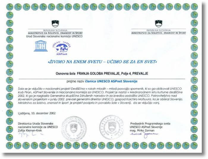 10.12. 2002 je OŠ Franja Goloba Prevalje na srečanju šol Unesco ASPNet Slovenije prejela naziv: