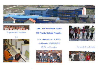 Učenci OŠ Franja Goloba Prevalje so se na zaključni prireditvi (31. maja 2007 v DD na Prevaljah) spet odlično izkazali in sicer predvsem z pesmijo in plesom. Harmonikarji, kar trije pevski zbori, plesni skupini, folklorna skupina, ansambelska igra, fantovski pevski zbor, ansambel Matjaža Kavtičnika, ... in še in še... Nastopajoče je čakala tudi manjša pogostitev. Upamo, da ste uživali...