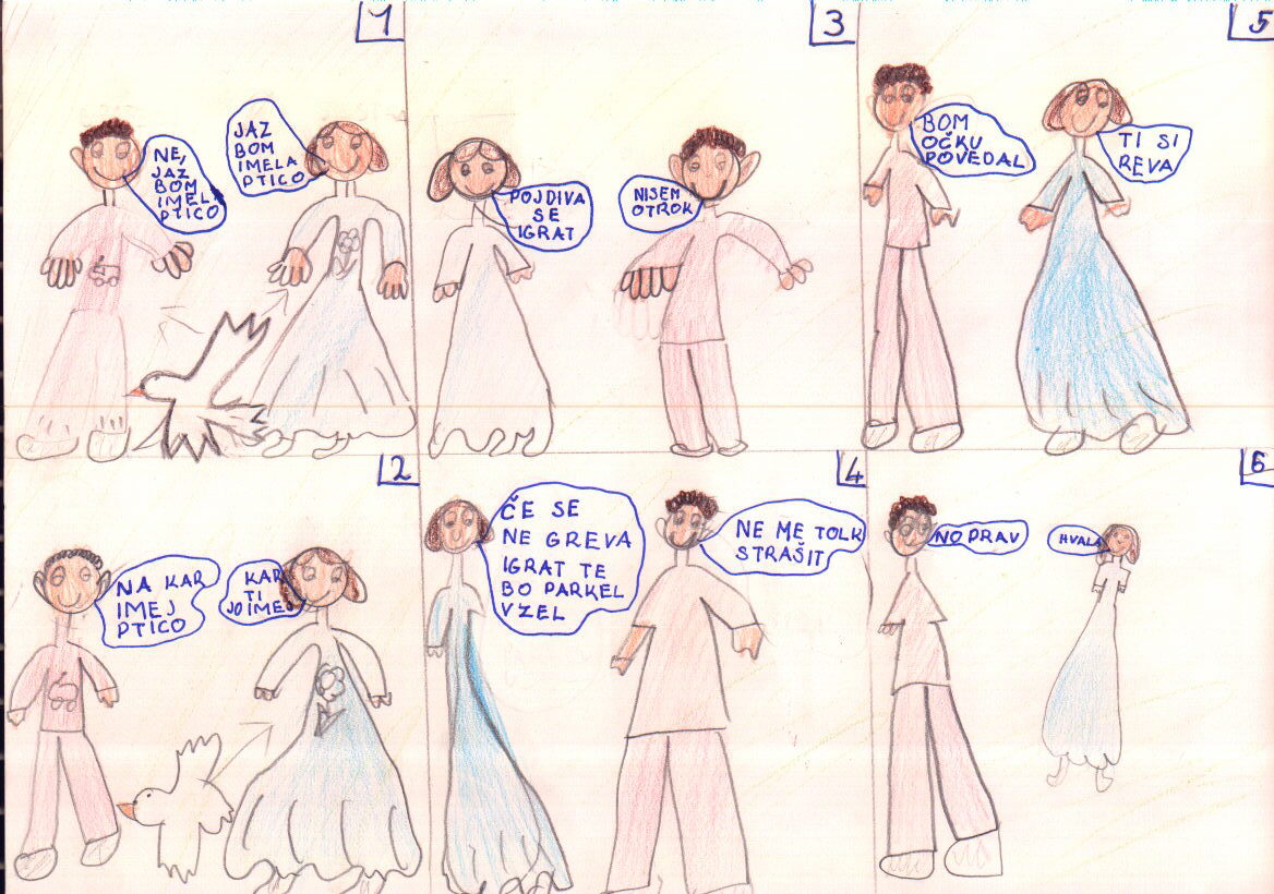 Viki: Ja. Pa, ko sem kasneje nadrla še Dušana, ker je vrgel svinčnik vame ... In ko me je tovarišica poslala ven.