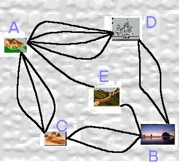 "Kot vidiš, stanujeva tu, v kraju, ki je označen z A. Dopust bi rada preživela na morju, v kraju B. Na poti tja bi si Stati rada ogledala kraj C, jaz pa kraj D. Povrh vsega pa vodi med temi kraji več različnih, tudi zanimivih poti. Ja, in lahko bi šla tudi po najkrajši poti, skozi E, čeprav sva tam že oba bila. Nikakor se ne moreva uskladiti in zato je ogenj v strehi. Ali nama lahko ti poveš vsaj to, koliko različnih variant poti imava med krajema A in B, če upoštevamo vse možne odseke?"