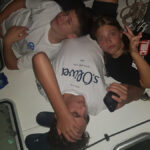 Danes smo tudi dolgo spali. Zbudili smo se okoli osmih, kar je zelo pozno. Po zajtrku smo izpolnjevali izpitne liste za junior-ske skiperske izkaznice. Nato smo se šli kopati in Žan in Žiga sta začela kuhati kosilo. Letos so skiperji spet zagodli našemu vodji Slovenskega Mirnega morja, tako da so mu »psička« (zvočnik in povodec) dali v škatlo in obesili visoko v zrak med našo in sosednjo barko. Danes smo tudi risali zastavo za našo barko in z flumastri, ki smo jih uporabljali za zastavo, smo si popisali bele majice in porisali noge. Malo smo se »okrasili« za disko, na katerem je bilo zelo luštno, samo malo preveč nemških pesmi. Nato smo se še na naši barki pogovarjali s prijatelji iz sosednje barke.