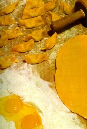 Knead flour, eggs, oil and water to form a soft dough (softer than for noodles). Leave it to rest for a while, then roll it out and cut into 8 x 8 cm large squares. Place the stuffing in walnut sized balls onto these squares. Fold the squares and press the edges tightly. Make ridge-shaped edges. Cook them in salted boiling water for 10 to 15 minutes, strain and sprinkle with breadcrumbs fried in butter, oil or lard.