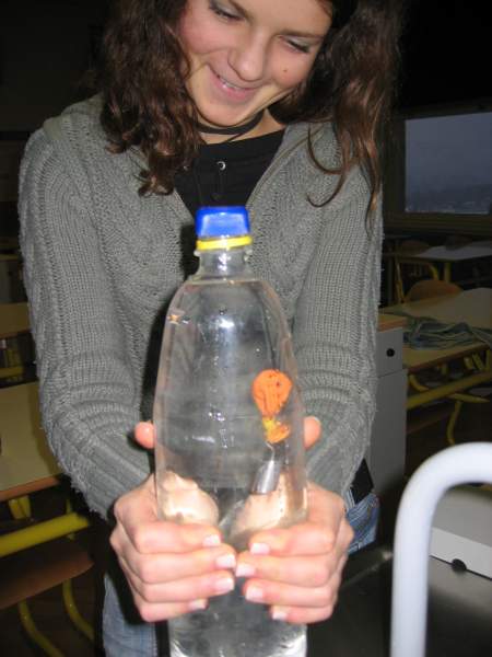 Z drugim poskusom sem ugotavljala, kako se podmornica dviga, spušča in lebdi. Pokazala sem, da kartezijski plavač deluje podobno kot podmornica.