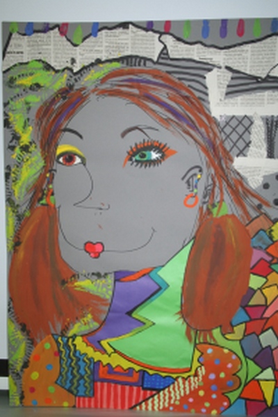 Slika je izdelana v različnih tehnikah: flomastri, tempera, lepljenka, odtisi materialov.