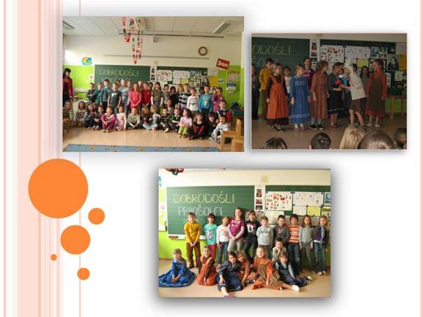 Sprejem so popestrili učenci drugega razreda s petjem in plesom, udeležili pa so se ga predstavniki vseh oddelkov naše šole.