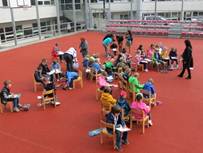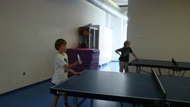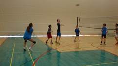 V šolski telovadnici so se učenci ukvarjali z različnimi športnimi aktivnostmi: odbojko, namiznim tenisom, badmintonom, nogometom, med dvema ognjema …