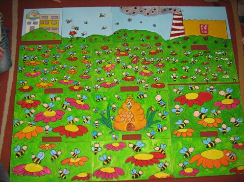 Slika malo bližje … Naslikali smo 140 čebelic za 140. rojstni dan Cinkarne Celje. Na levem hribčku stoji naša šola, na desnem hribčku stoji Cinkarna.