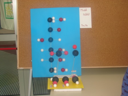 V prvih dveh urah so učenci pod vodstvom učiteljice Suzane Strohmaier delali papirnate krogle in jih oblepili s kuhinjskimi papirnatimi brisačami. Kasneje so jih prebarvali v barvi molekule in tako je nastal končni izdelek – model organskih molekul. Pri tem delu so potrebovali škarje, kuhinjske papirnate brisače in tempera barve. Hano Posinek, 8. a |