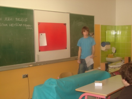 1. in 2. uro so si ogledali Powerpoint projekcije o Bruselju ter ugotavljali, kateri so trije uradni jeziki Belgije. Naslednje tri ure pa so v delavnicah s pomočjo knjižnih in spletnih slovarjev izdelali francosko-nizozemsko-angleško-nemško-slovenski slovar. Vodja te delavnice je bila Aleksandra Velenšek. Blaž Ivanšek, 8. a |
