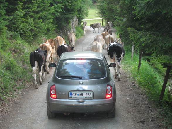 Ob vožnji domov smo imeli svečano spremstvo. Planinske krave so se tako poslovile od nas.