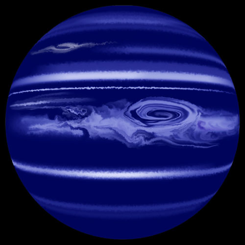Neptun je svetla modra krogla (pravzaprav je najbolj moder planet v osončju), skoraj brez geoloških značilnosti.V času ko ga je fotografiral Voyager, se je čez poloblo v nasprotni smeri od vrtenja planeta pomikal vihar, imenovan Velika temna pega, ki pa je sedaj že izginil. Divjal je z hitrostjo 2000 km/h