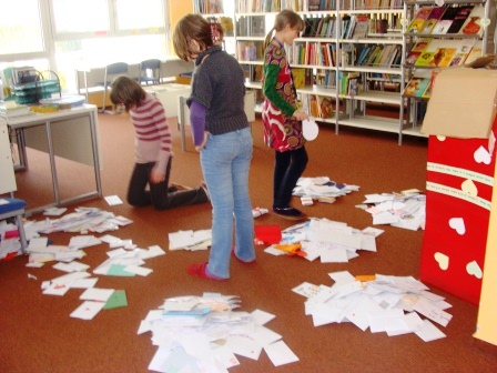 Skupina učencev ob pomoči knjižničarke pisma razvrsti po