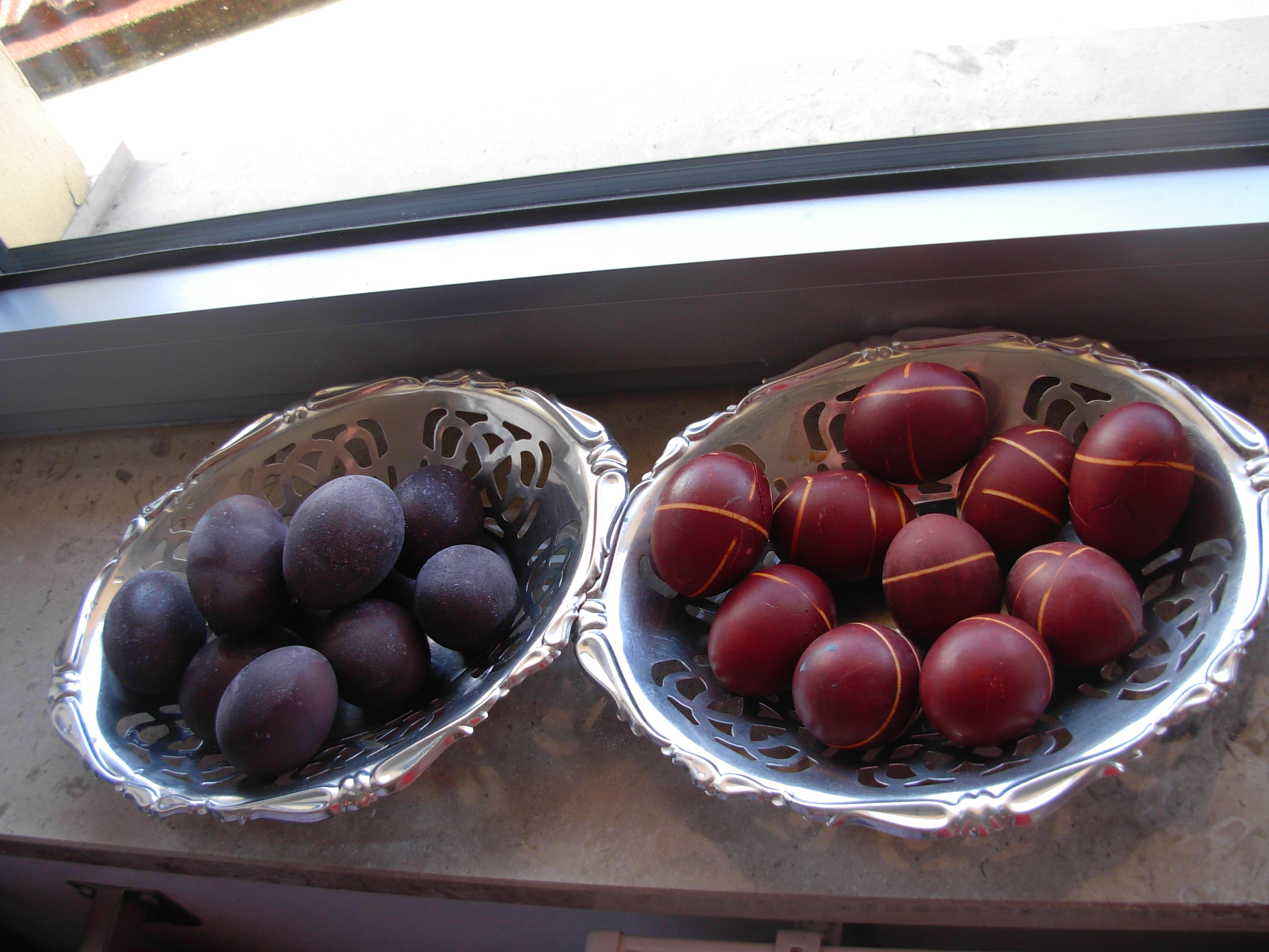 jajca: ena v teran, druga, z elastiko, pa v čebulo. Okrašene