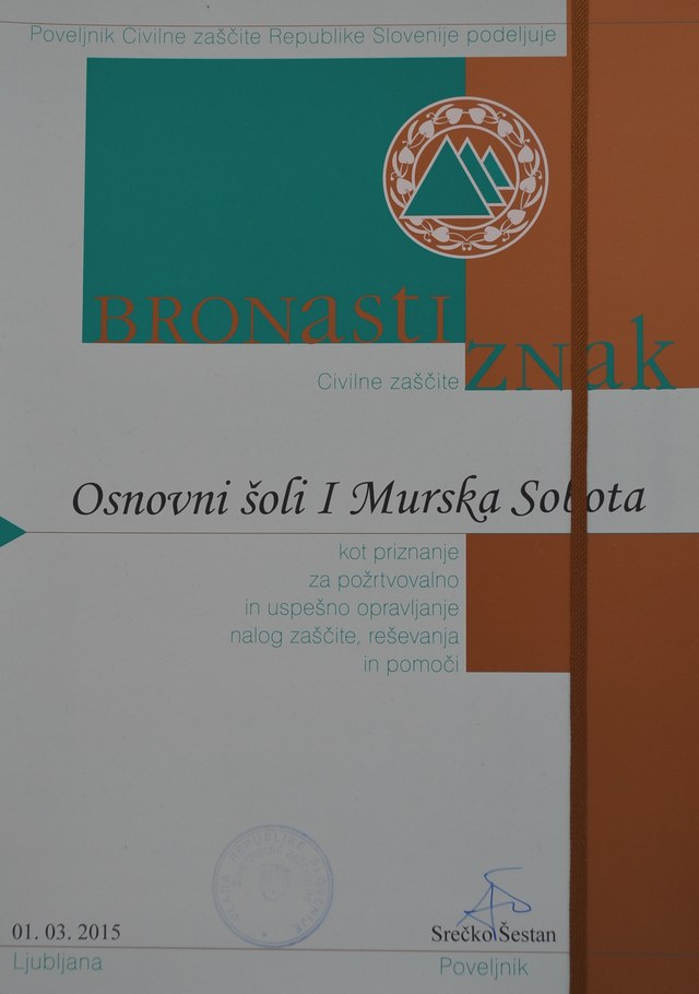 Na osrednji regijski slovesnosti ob dnevu Civilne zaščite, ki je potekala 3. marca v Gledališču Park M. Sobota, smo s strani Civilne zaščite prejeli priznanje - bronasti znak Civilne zaščite, ki se podeljuje posameznikom, skupinam in organizacijam za požrtvovalno in uspešno opravljanje nalog zaščite, reševanja in pomoči.